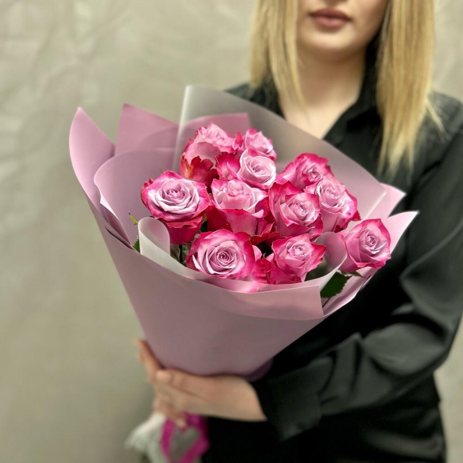На фото букет из 11 фиолетовых роз. В составе: роза 11 шт, дизайнерская упаковка 1 шт, атласная лента 1 шт, . Все цветы свежие и ароматные, букет красиво оформлен и отлично подходит для подарка. Доступна доставка цветов или самовывоз.