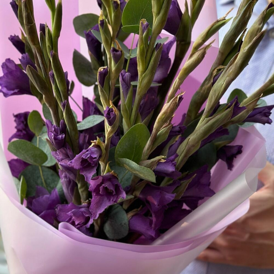 На фото букет из 9 фиолетовых гладиолусов. В составе: гладиолус 9 шт, дизайнерская упаковка 2 шт, атласная лента 2 шт, . Все цветы свежие и ароматные, букет красиво оформлен и отлично подходит для подарка. Доступна доставка цветов или самовывоз.