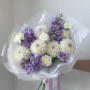 На фото букет «сиреневое облако». В составе: георгина 5 шт, маттиола 4 шт, гвоздика 5 шт, дизайнерская упаковка 1 шт, атласная лента 1 шт, . Все цветы свежие и ароматные, букет красиво оформлен и отлично подходит для подарка. Доступна доставка цветов или самовывоз.